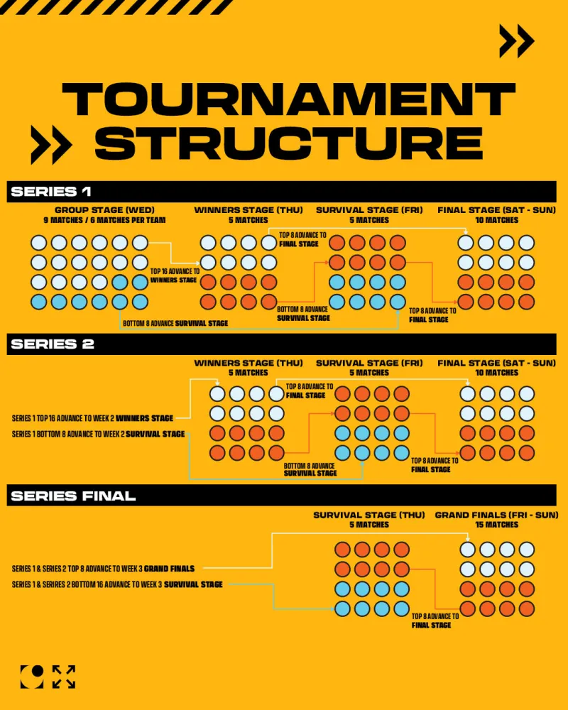 系列赛 2(第二周):各队根据系列赛1成绩进行分组,选手们将迎来排名攀升或下滑的转折点。